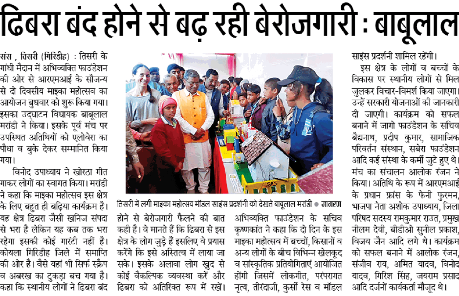 On January 22nd and 23rd, 2020, a 2-day MICA Festival was organised by Responsible Mica Initiative (RMI)-led Abhivyakti Foundation, Samajik Parivartan Sansthan and Jago Foundation at Tisri in Giridih (Jharkhand, India). Mr. Babu Lal Marandi, Ex-Chief Minister of Jharkhand and sitting Member of Legislative Assembly (MLA) inaugurated the MICA Festival. The list of honourable attendees included Mr. Deepak Tiwary (District Judge), Mr. Ashok Upadhyay (District Vice-President of Bhartiya Janta Party i.e. BJP), Mr. Rajkumar (District Panchayat Head), Mr. Sunil Prakash (Block Development Officer) and Mrs. Neelam Devi (Tisri Block Panchayat Head), together with RMI team: Mrs. Fanny Fremont (RMI Executive Director), Mr. Vijay Jain (RMI Country Head), Ajay Sharma (Manager, Community empowerment Program)