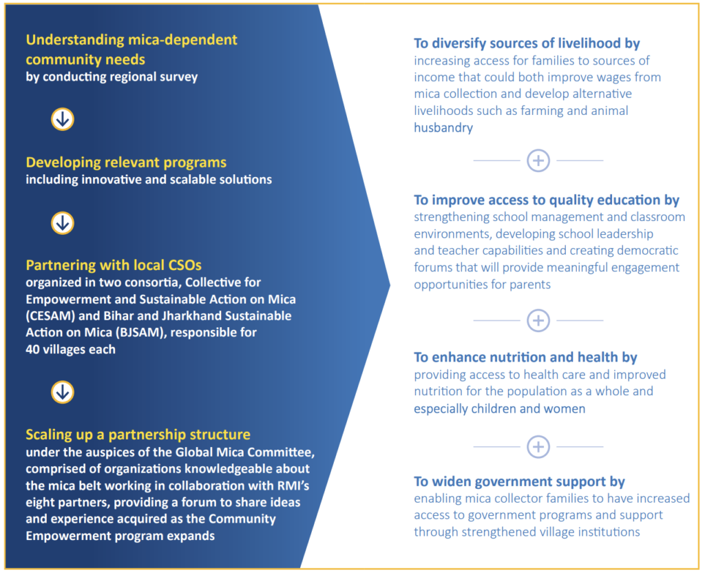 Community Empowerment Programs are being implemented in 80 villages, benefitting to 30,000 people in Bihar and Jharkhand, by eight partners selected by the Responsible Mica Initiative.
